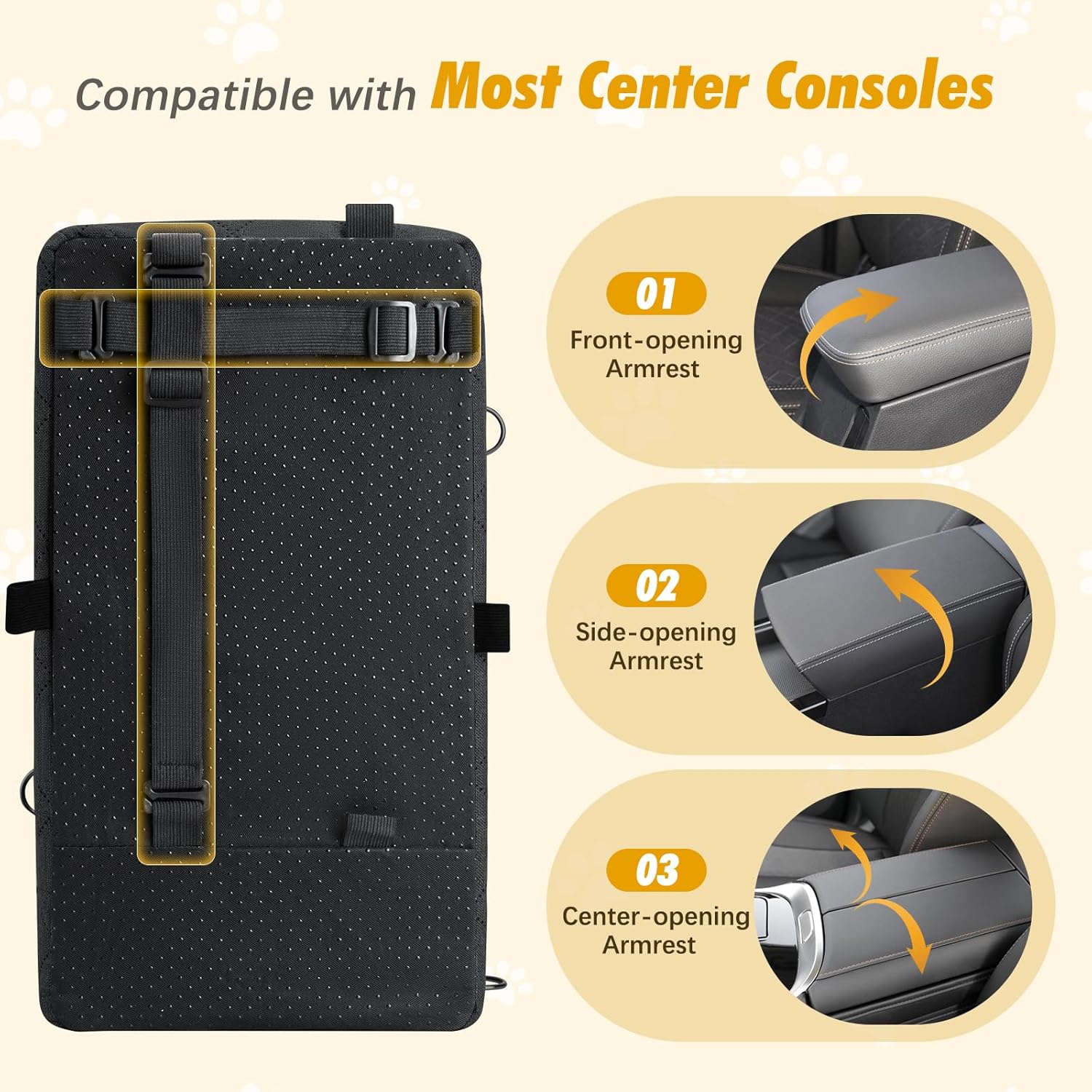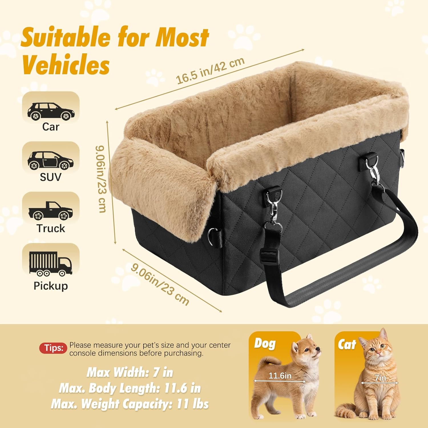 Custom-designed for vehicle center consoles, this dog car seat for small dogs accommodates pets weighing up to 11 lbs/5 kg with a body length (from neck to hip) not exceeding 11.6 in/29.5 cm. Dimensions: 16.5×9.8×8.7 in/42×25×22 cm. Measure your pet’s size and vehicle center armrest dimensions before purchasing.